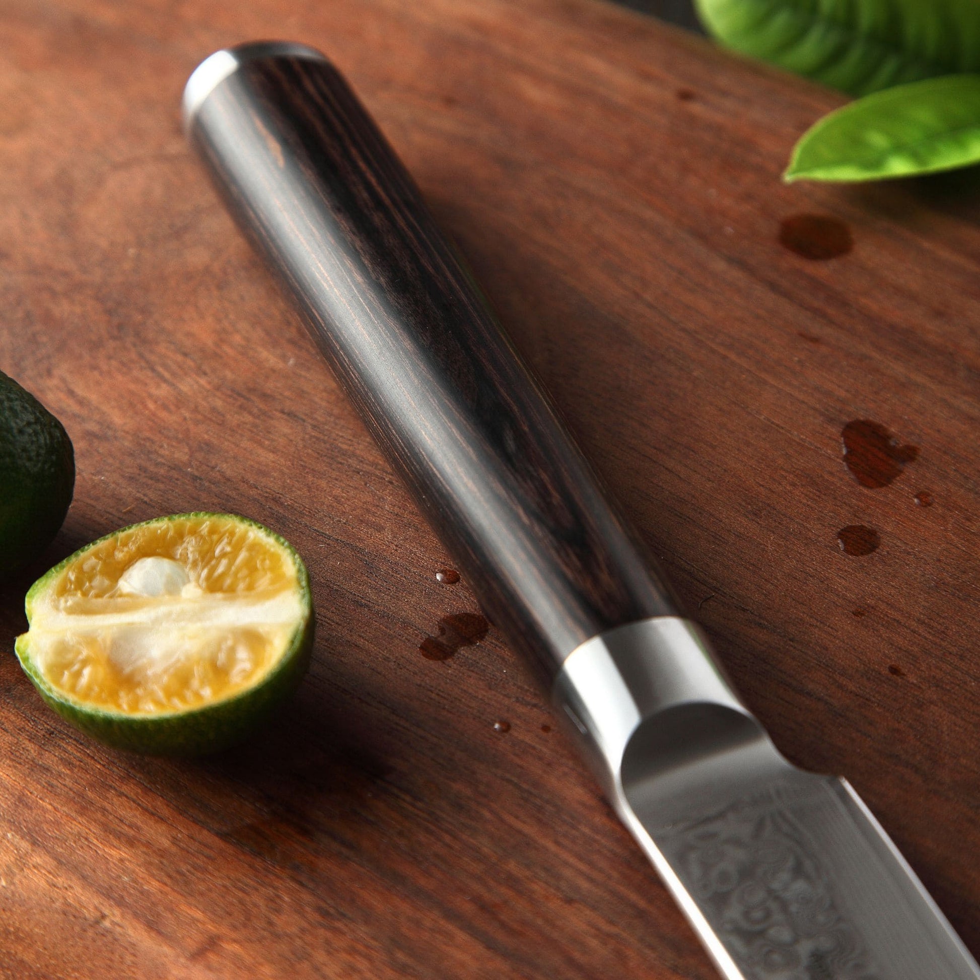 Das ergonomische Griffdesign der He Serie sorgt für höchsten Komfort und optimale Beweglichkeit, sodass alle Lebensmittel mühelos geschnitten werden können. Gefertigt aus strapazierfähigem Pakkaholz, das sich weder leicht verformt noch reisst, liegt der Griff nahtlos und sicher in der Hand. In Kombination mit der eleganten Edelstahl-Endkappe entsteht ein Griff, der Stabilität, Langlebigkeit und stilvolle Eleganz vereint.