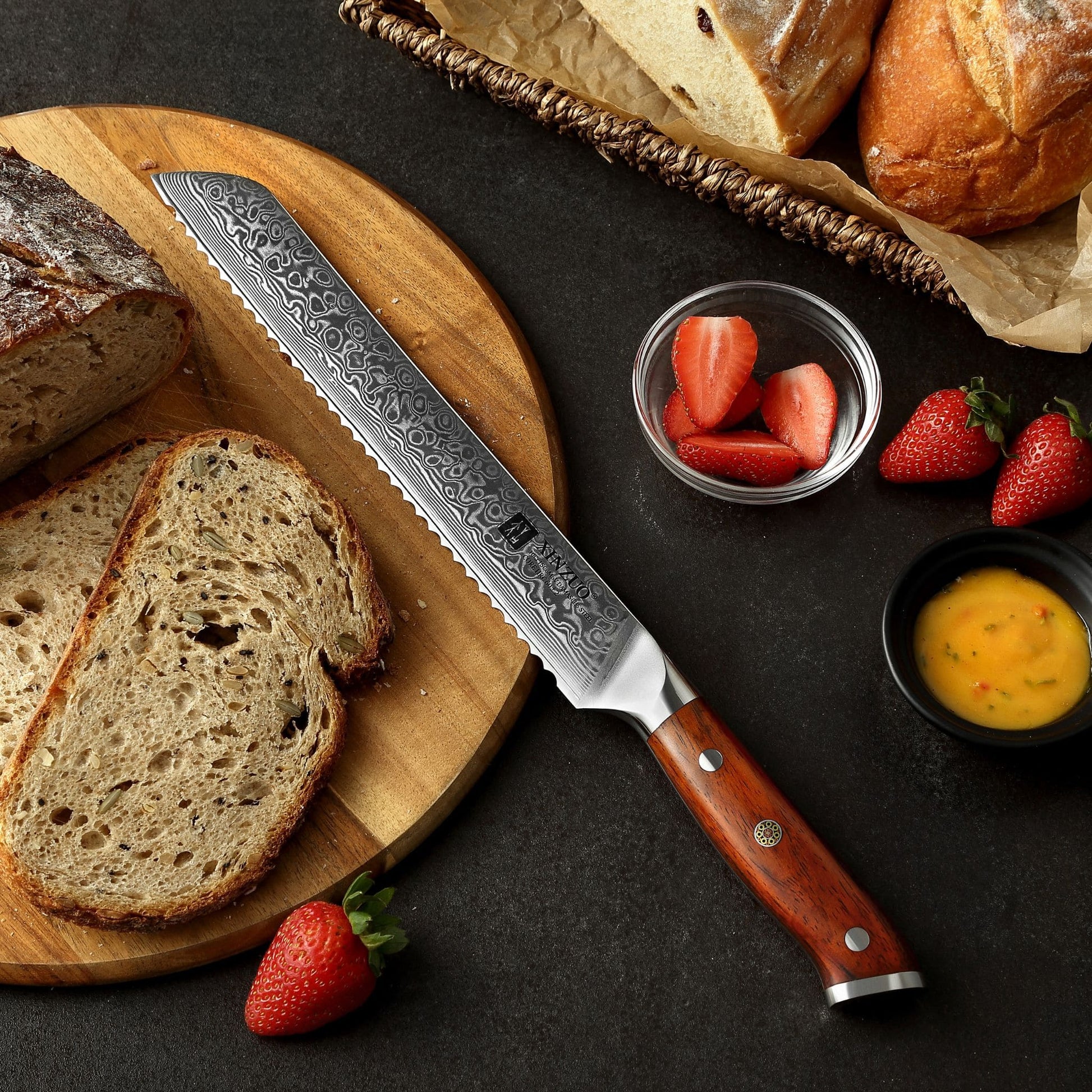 Die edlen Griffe aus Rosenholz mit hellen Einlagen sorgen für sicheren Halt und ausgewogene Führung. Das 5er-Set vereint Chef-, Santoku-, Allzweck-, Rüst- und Brotmesser – die komplette Ausstattung in einer Linie.