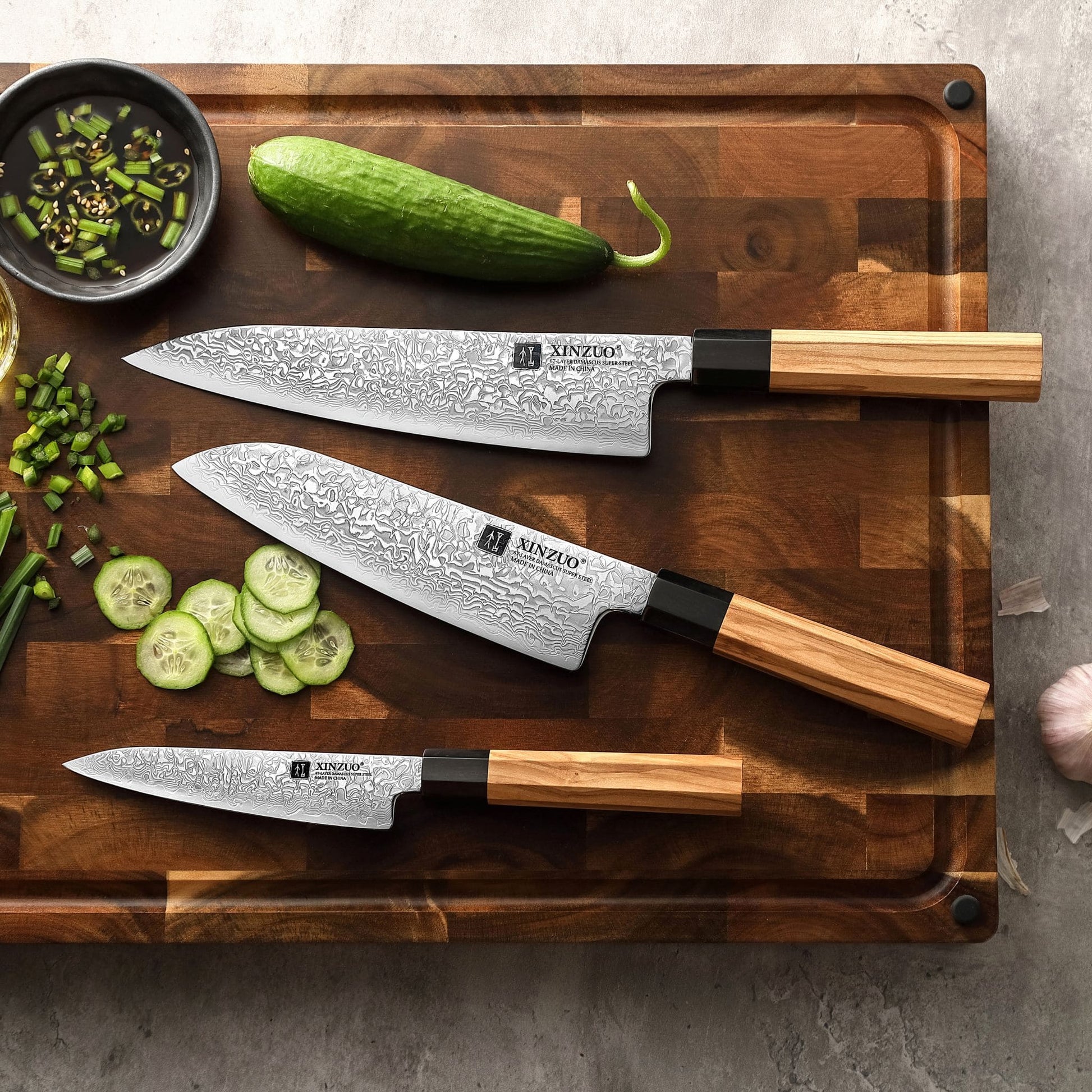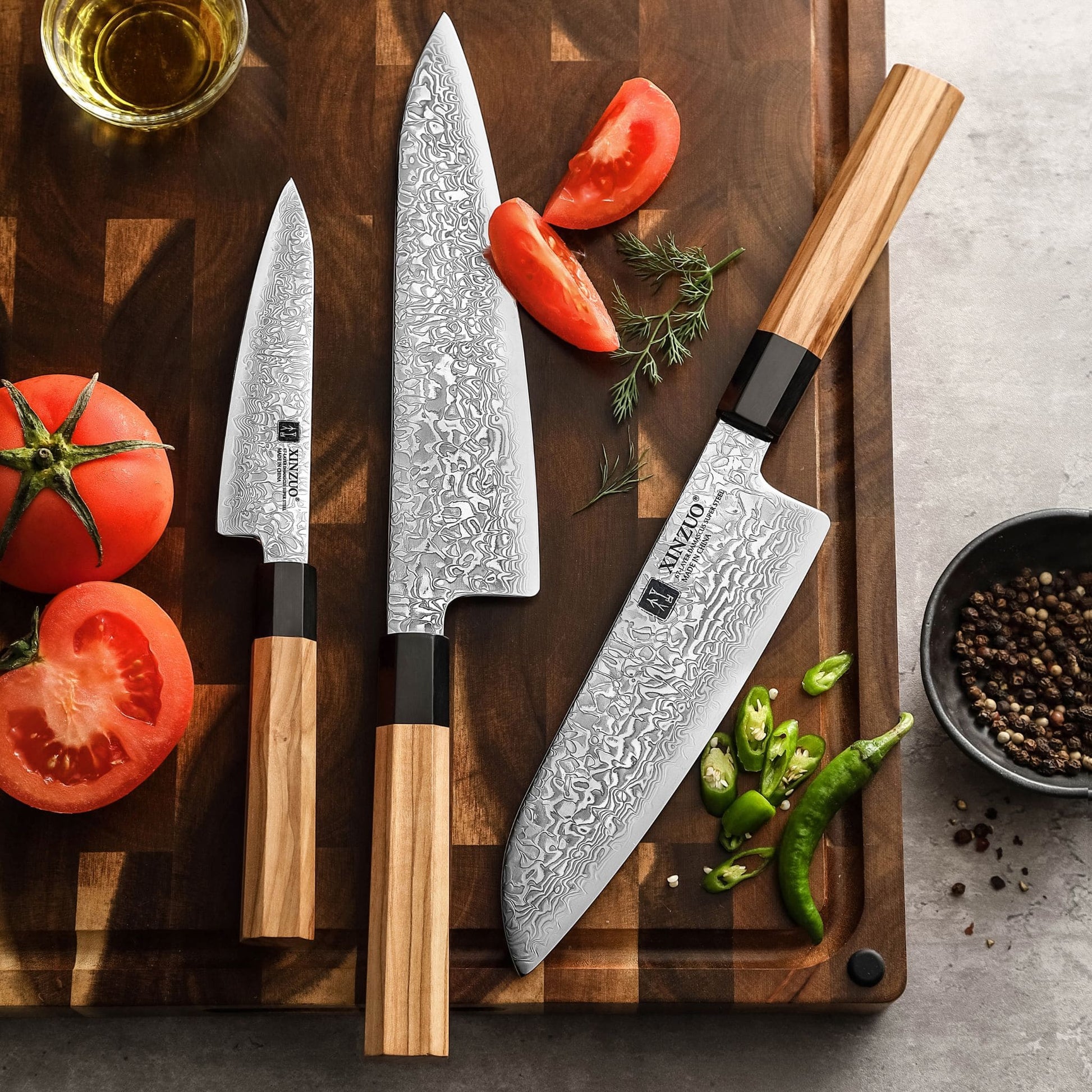 Japanische Eleganz für den Alltag: Das Zhen Serie 3er Messerset vereint Chef-, Santoku- und Allzweckmesser in perfekter Balance.