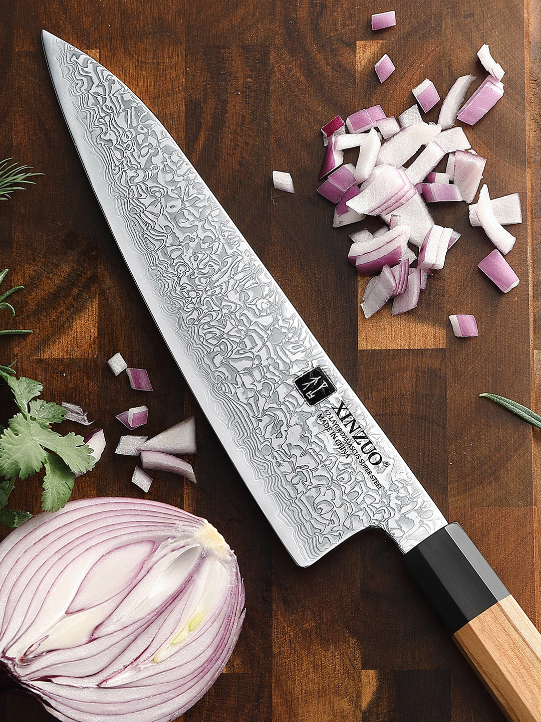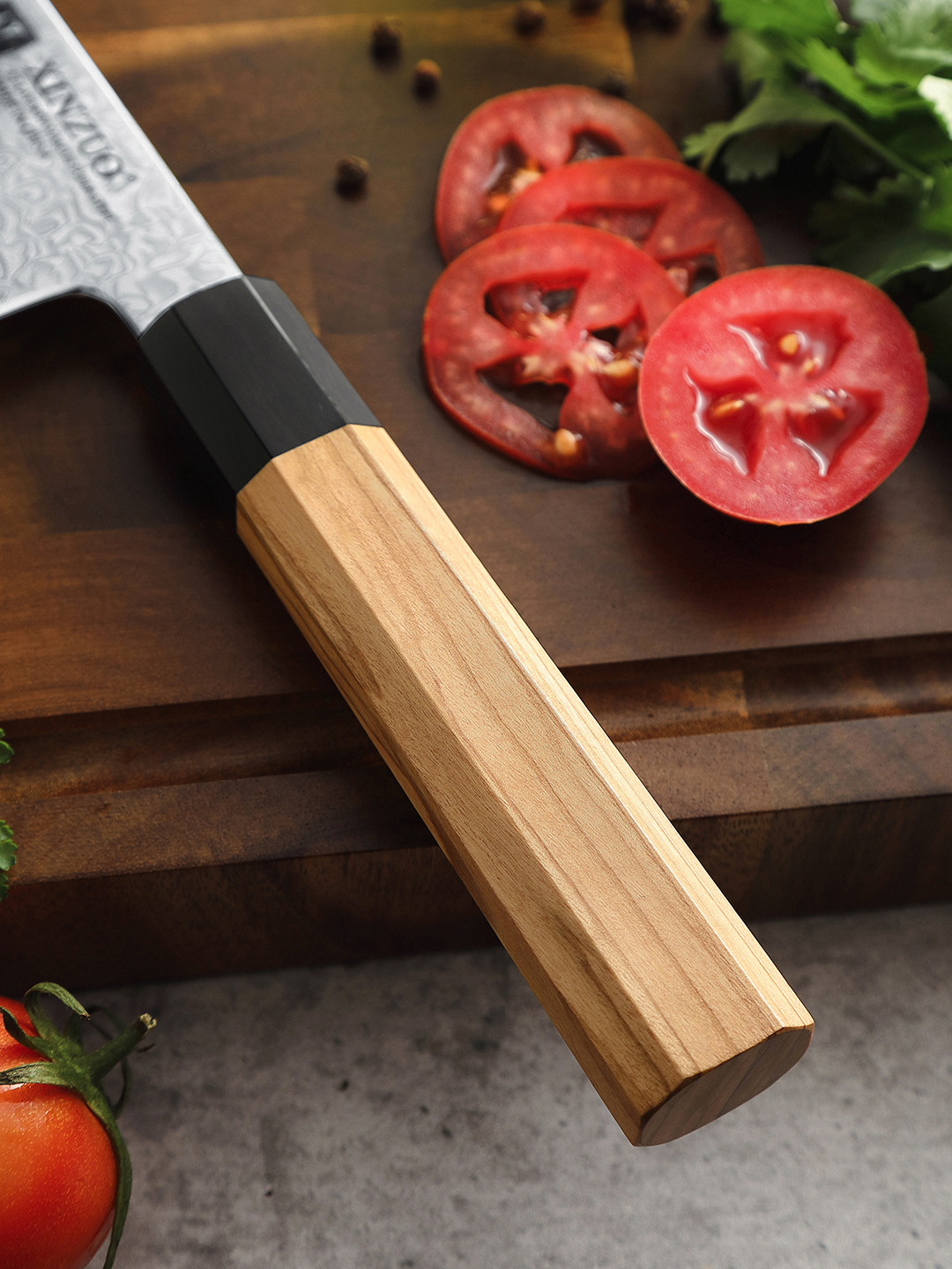 Die Klinge der Zhen Serie wird aus 67 Lagen hochwertigem Damaszenerstahl gefertigt und besitzt einen Kern aus 10Cr15CoMoV-Stahl. Durch Vakuum- und Tiefkühl-Wärmebehandlung erreicht sie eine Härte von 62 HRC und überzeugt mit aussergewöhnlicher Robustheit, Korrosionsbeständigkeit und Zähigkeit. Die Klinge wird in traditioneller Nassschleiftechnik bearbeitet und mit einem präzisen 15°-V-Schliff veredelt – für langanhaltende Schärfe. Fleisch, Fisch und Gemüse lassen sich mühelos in hauchdünne Scheiben schneiden – auch bei täglichem Gebrauch.