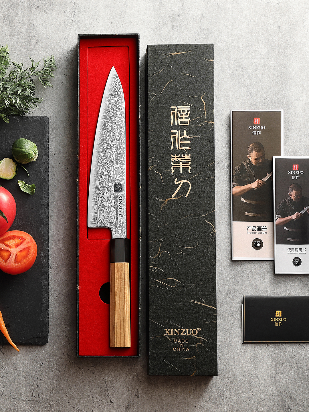 Die Zhen Serie steht für stilvolle Präzision. Klingen aus 67 Lagen Damaststahl bieten zuverlässige Schärfe und Langlebigkeit, veredelt durch Vakuum-Wärme- und Tiefkühlbehandlung. Das Set deckt alle Schneidaufgaben ab – von filigranen Kräutern bis zu festen Gemüsen.