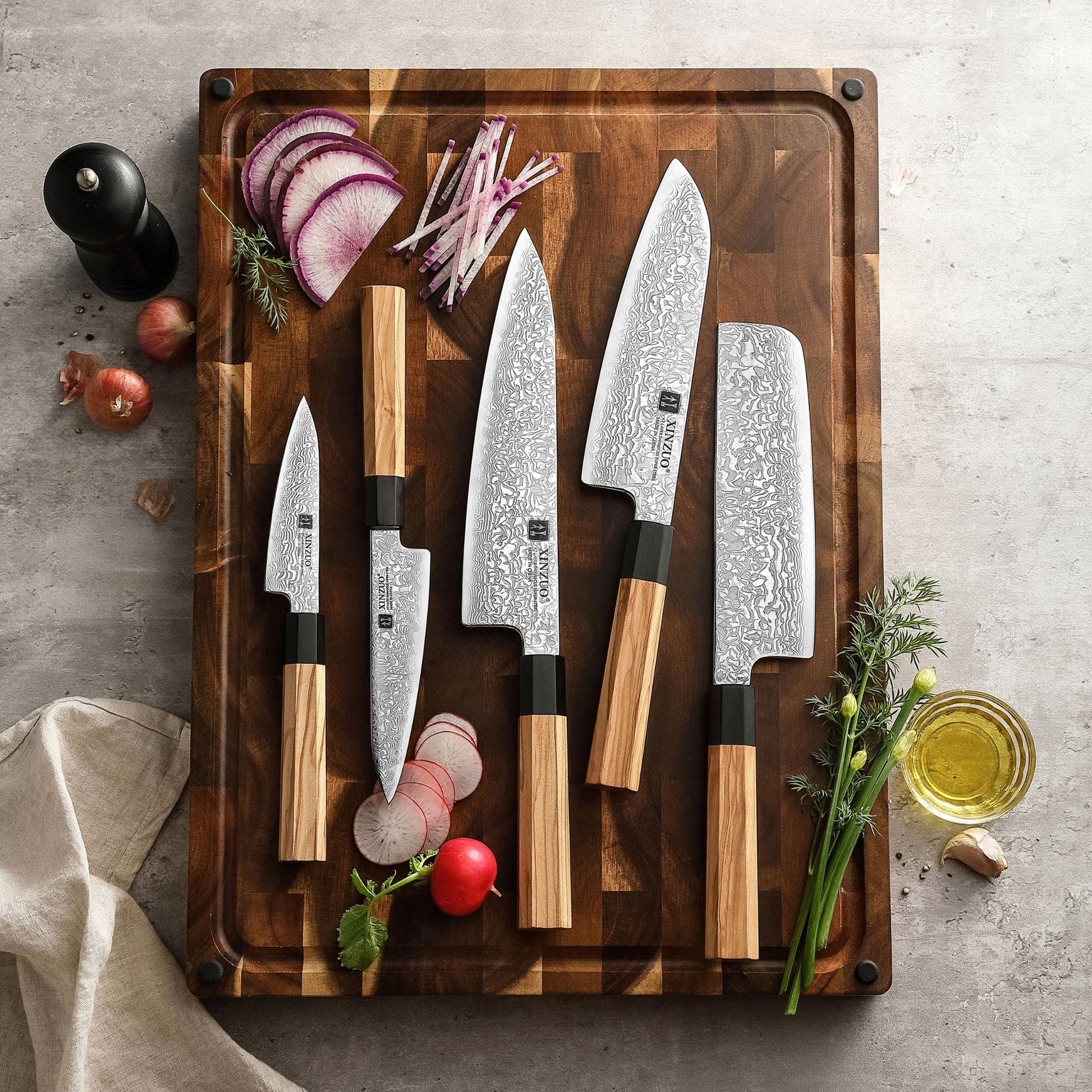 Komplette Ausstattung in japanischer Formensprache: Das Zhen Serie 5er Messerset bietet Präzision und Harmonie für jede Küche.